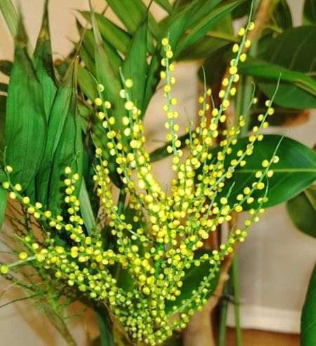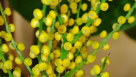 やっと咲いたテーブルシダの花。 いつもの年より1か月遅い開花となった。 寒さが厳しく、非常に乾燥した日が続いたからだろうか? 今までに比べ花一つ一つが小さい。 2~3mmほどの花だが、花弁が閉じたままポロポロと落ちていく。 去年は小さな丸い花をばらばらに分解したが、もう今年はしない。 せっかく咲いた花だから・・・ 花びらが開かないで散る花もある。 それでいいんだと思うことにした。