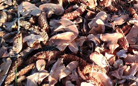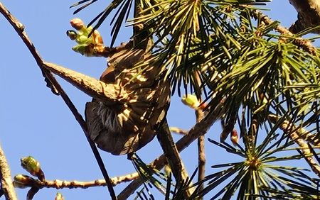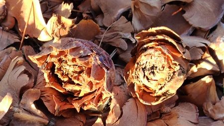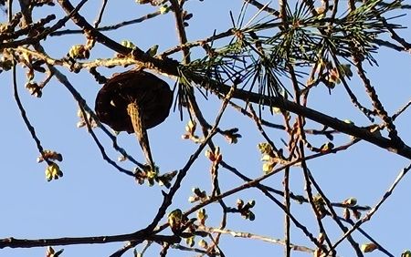 風は強いが暖かな日和となった。 河津桜の開花状態を確認しようと、ウォーキングを兼ねて出かけた。 先日出かけた日より1週間が経つが、まだまだ開花には至らない。 やっと見つけた咲きかけの桜が数輪見つかった。 大田原の厳しい寒さが影響しているのだろう。 目を凝らして河津桜の枝を見ていると、「エッなになに!」不思議なものが目に付いた。 画像にして調べてみようとスマホを向けるが、風が強くてなかなか撮れない。 1度は家に戻ったが、気になって再度出かけた。 落下していた長い枝で河津桜の枝に引っかかっていた不思議な物体の枝を手にすることができた。 謎の物体が分かってきた。 ヒマラヤスギの球果が熟して、球果の鱗片がパラパラと落ちるらしい。 先端だけはまとまって落ちるらしい。 この先端部分はシダーローズと呼ばれている。 これは、今までに何度も見ている。 私が不思議な物体と思ったのは枝近くの鱗片が皿のような形で残ったものだった。 尖った果軸はいつまでも枝に残るらしい。 たまたま風で折れた枝についていた果軸が、桜の木に引っかかって 目に留まったのだった。 ヒマラヤスギは「雌雄同株又は雌雄異株・雌雄異花」の針葉樹で杉科ではなく松科の植物だそうだ。 絨毯のように落下した落ち葉は混ざっていて、同株・異株の区別はつかないが、秋になったら観察に出かけてみよう。 河津桜の開花状況を見に行っただけなのに、すっかりヒマラヤスギの観察になってしまった。 自然って面白いな、楽しいなと思った。